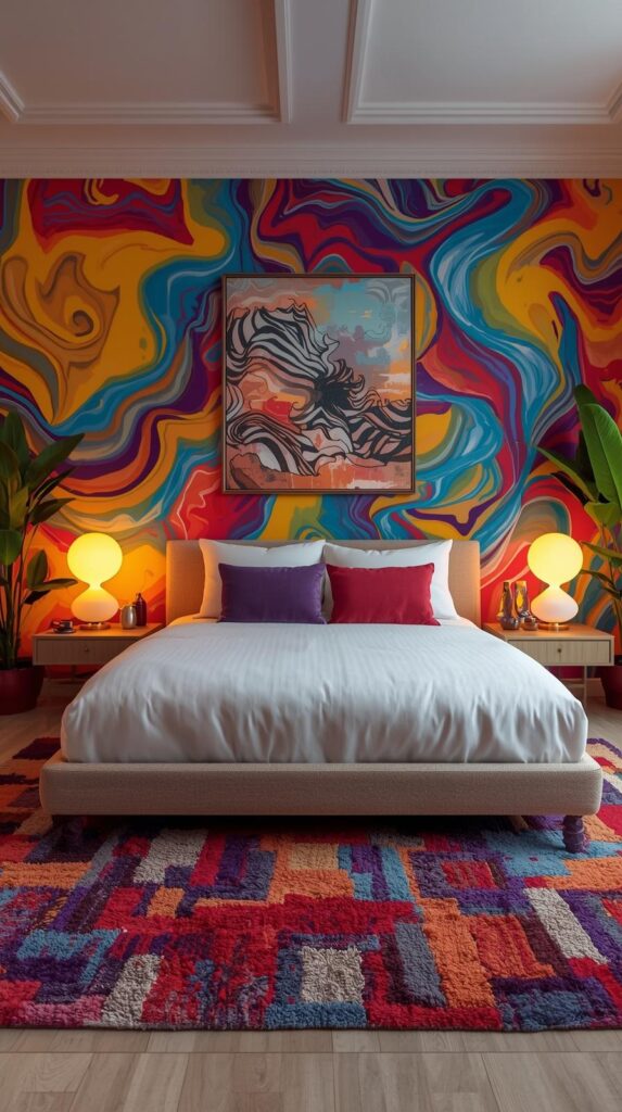 Turn one wall into a work of art with a bold mural or wallpaper. Match it with contemporary furniture and fun decor for an eclectic space.