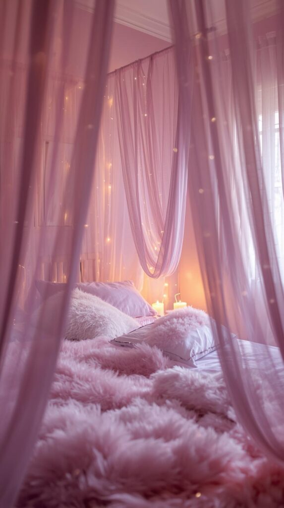 Let soft pink, lavender and pastel blue tones turn your bedroom dreamy and romantic. And with the sheer curtains, candles, fairy lights, it’s such a magical atmosphere.