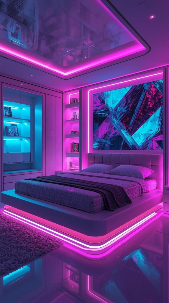 For something more daring and of the moment, consider having a neon future bedroom design. Add LED strip lights, illuminated wall art, and modern furniture! It’s perfect for tech lovers.