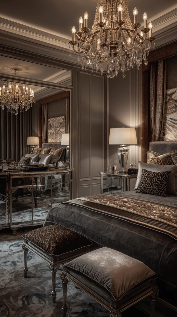 Add mirrored furniture, metallic accents and bold chandeliers for a chic look. Toss in a little of velvet or silk if you want to make it extra luxurious.