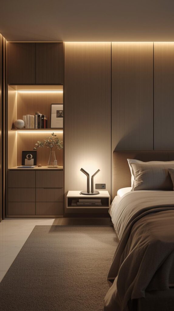 A bedroom filled with high-tech gadgetry including smart lighting, voice-controlled devices and state-of-the-art furniture. Top it off with wireless chargers and stealth storage.