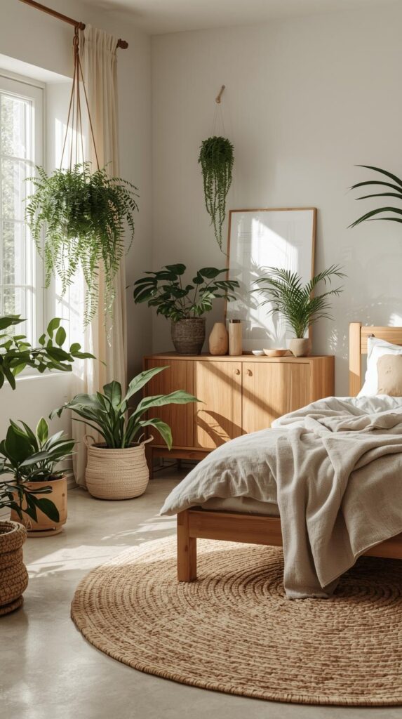Transform your space into a mini jungle with indoor plants, earthy colours and natural wood furniture. It makes for a delightful and green area.