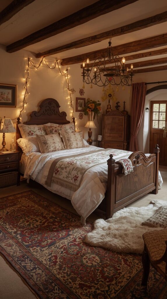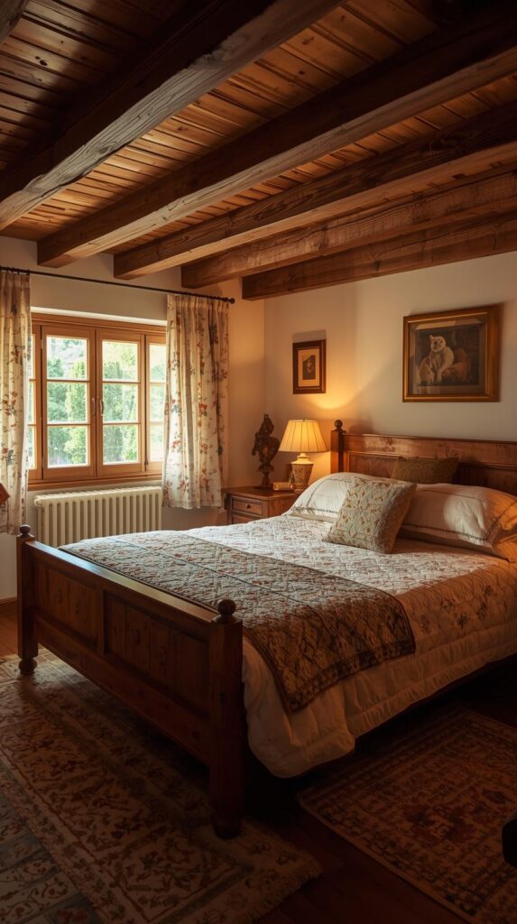 If you want a warm and cozy feeling, a bedroom in cottage style is your pick. Opt for floral bedding, delicate rugs and wooden furniture. Use fairy lights or candles for extra hygge.