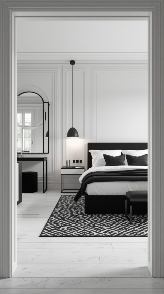 There’s never an expiration date on black-and-white bedrooms. Gives weight to the otherwise minimal look with print and patterned cushions, a geo rug, and contemporary lighting.