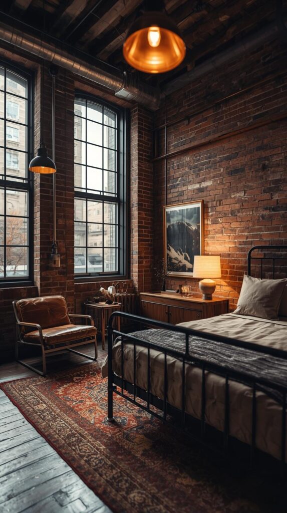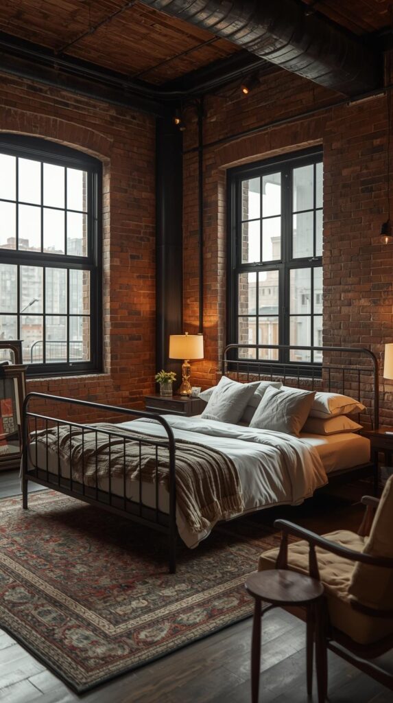 Your bedroom features exposed brick walls, metal framing and big windows for that industrial chic vibe. Pair it with warm lighting and pared-down furniture for harmonious balance.